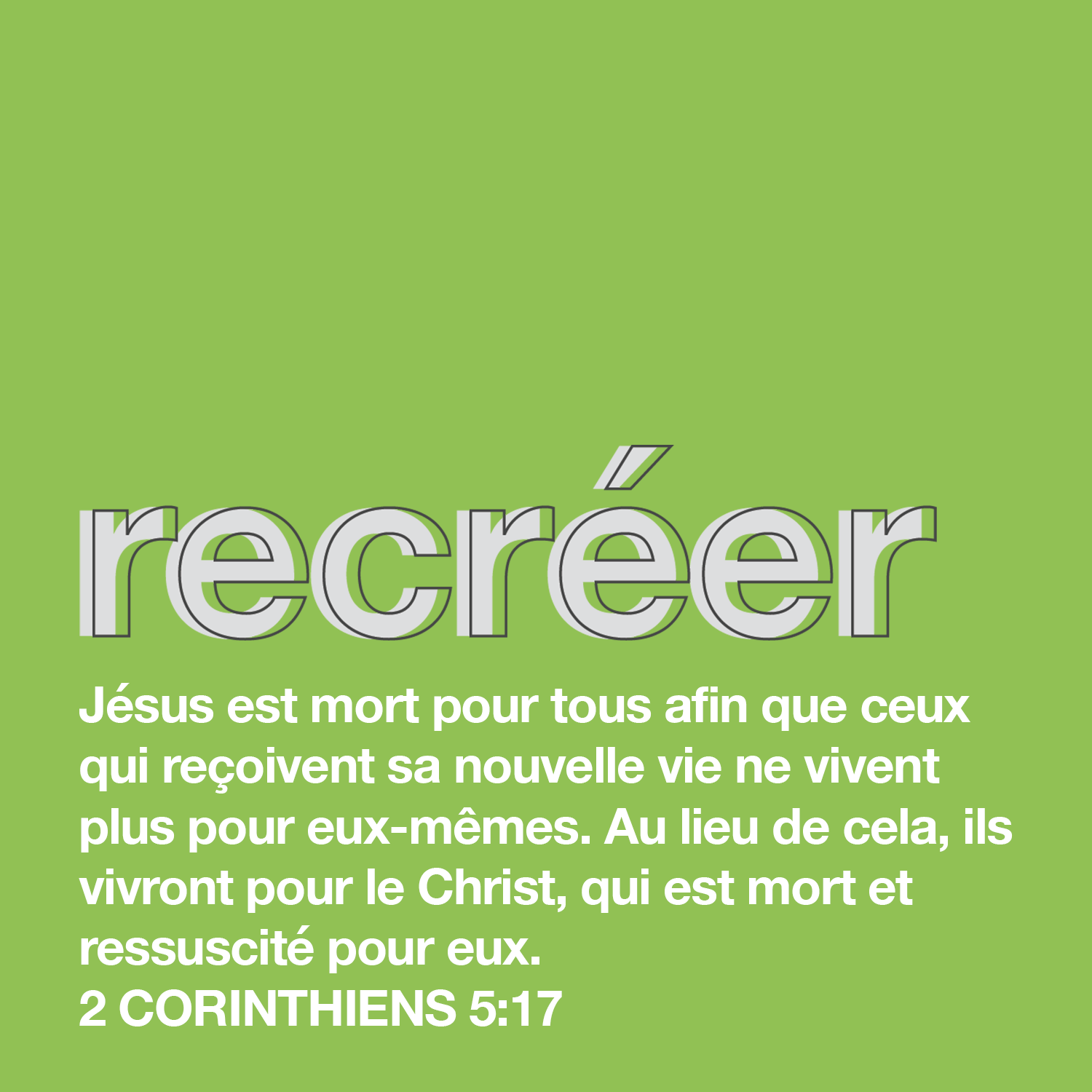 Pendant sept semaines, grâce à la série de courriels Recréé, tu peuxréfléchir à la façon dont Dieu te recrée de la tête aux pieds, autant àl'intérieur qu'à l'extérieur. Tu recevras des vidéos d'Andrew et Wendy,de courtes méditations et des incitations à «essayer»!